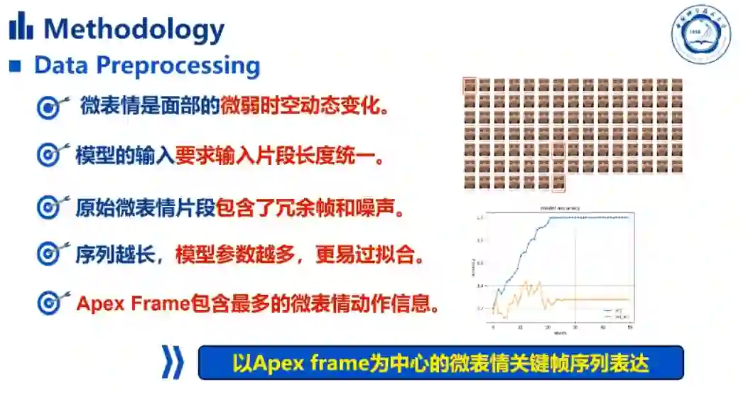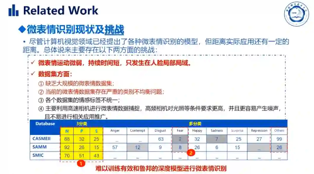 另外,赵同学详细分析了微表情识别遇到的挑战,其中主要的限制就是微表情本身微弱、局部且短促的特性,以及微表情数据集的小样本问题和样本分布不均问题。