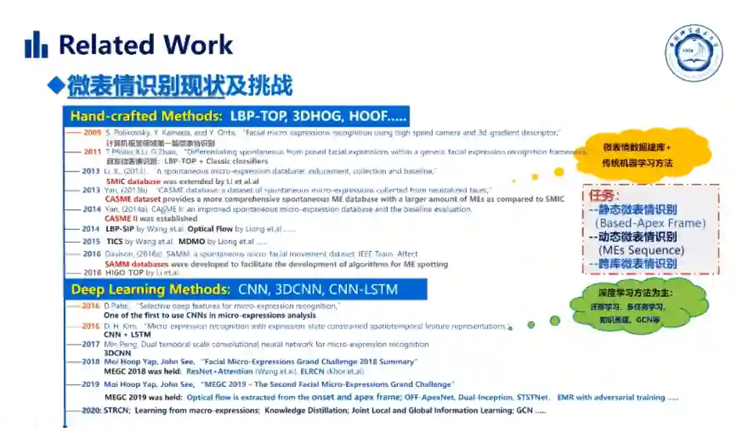 然后,赵思蕊同学列举了微表情识别现状,包括传统的手工特征提取方法以及基于深度学习的微表情识别方法。