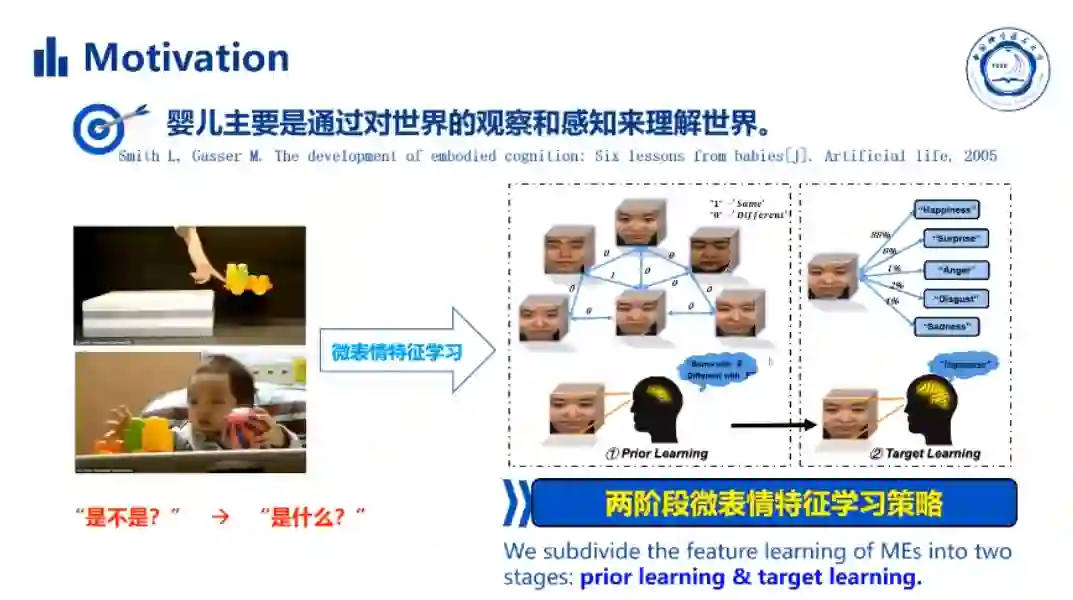 基于上述的微表情识别中的挑战,赵同学等人开始探索如何利用小样本微表情数据集训练一个能提取High-level时空微表情特征的深度卷积神经网络模型。受启发于婴儿通过对世界的观察和感知来理解世界,他们提出了两阶段的微表情特征学习策略,包括学习微表情一般特征的预先学习和微表情分类特征的目标学习。