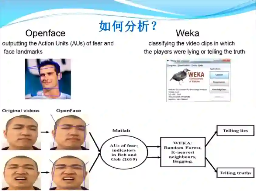 申博士等人采用计算机视觉技术,加上机器学习来进行分类,从而发现人工识别欺骗时可能会错过的细微的恐惧表情线索。他们用计算机视觉开源软件OpenFace分析了一个真人游戏电视节目“The moment of truth"中人物在说谎和说真话时的恐惧表情,将软件的输出用机器学习软件WEKA进行分类,并对输出数据进行了心理学的统计分析。