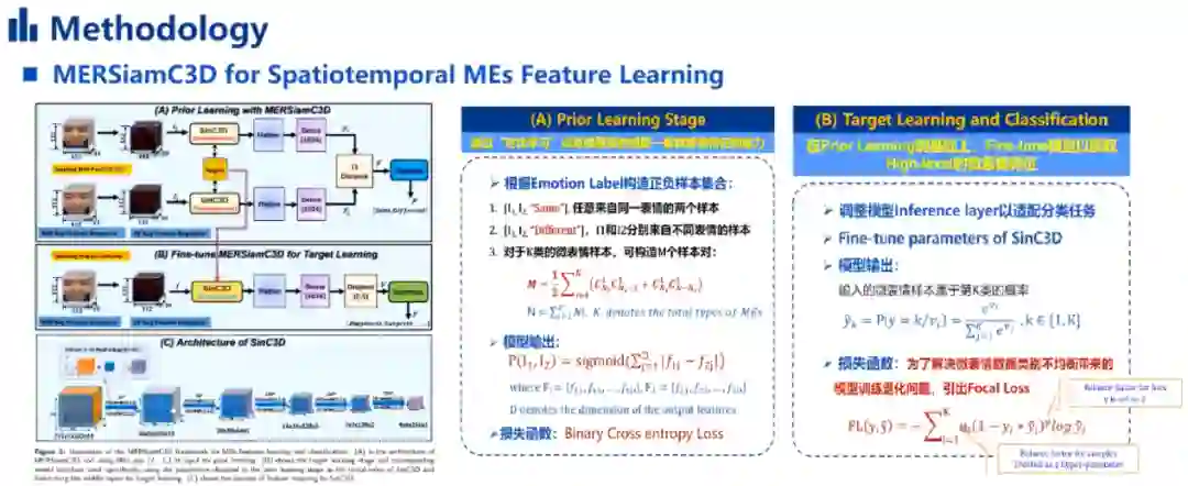 然后,赵同学等人设计了MERSiamC3D来进行时空微表情特征学习。在预先学习的阶段,通过“对比学习”训练模型获得提取一般微表情特征的能力。其中,相同的分类为来自同一个表情的两个样本,不同的分类为来自不同表情的样本。在预先学习的基础上,微调模型来获得high-level的微表情特征从而进行微表情的情绪分类。同时,为了解决微表情数据类别不均衡带来的模型退化问题,引入了Focal Loss。