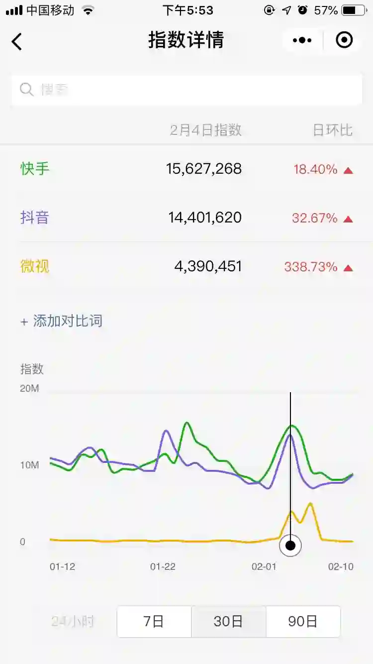 从效果看来,三大平台微指数均呈现出小高峰,尽管指数悬殊依旧,但微视的日环比达338.73%,是抖音的整整10倍。