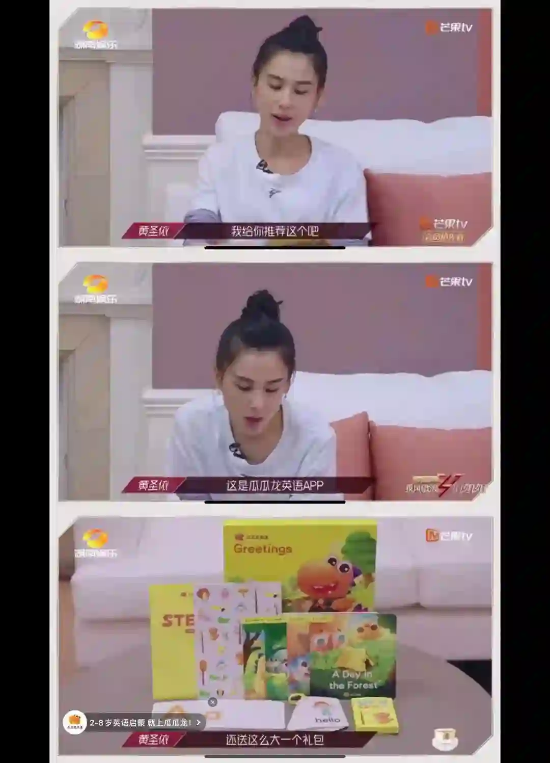 同样的情况还有瓜瓜龙。在第四期节目中,黄圣依和蓝盈莹两人聊到孩子各自的孩子,突然话题一拐讲到现在孩子学英语有困难,黄圣依立马拿起平板开始介绍瓜瓜龙,接着就是一段瓜瓜龙APP页面的展示画面外加功能介绍式的广告语,多少还是略显刻意。