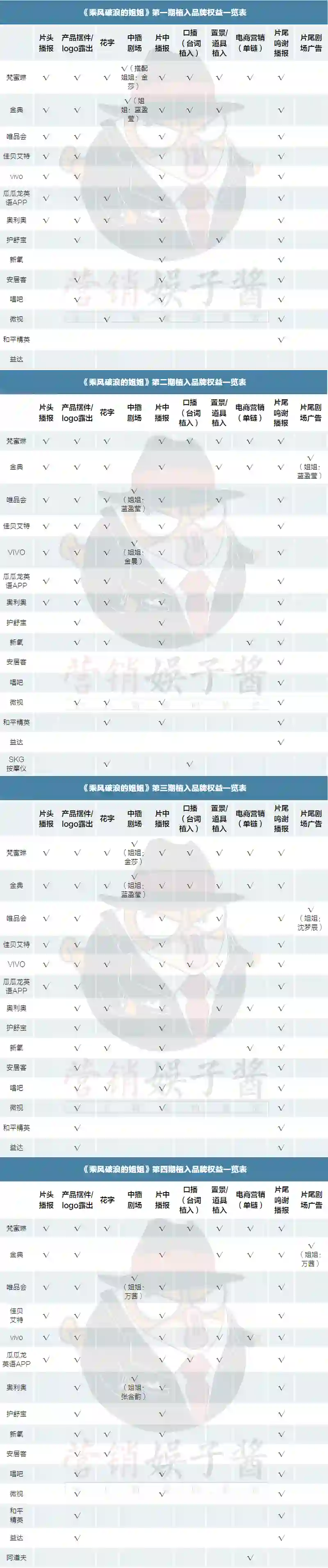 事实也证明权益的多少并不意味着品牌一定能找到合适的露出机会,关键在于品牌调性与节目的契合度。观察下来,选择《浪姐》的品牌或多或少会存在一定的顾虑。