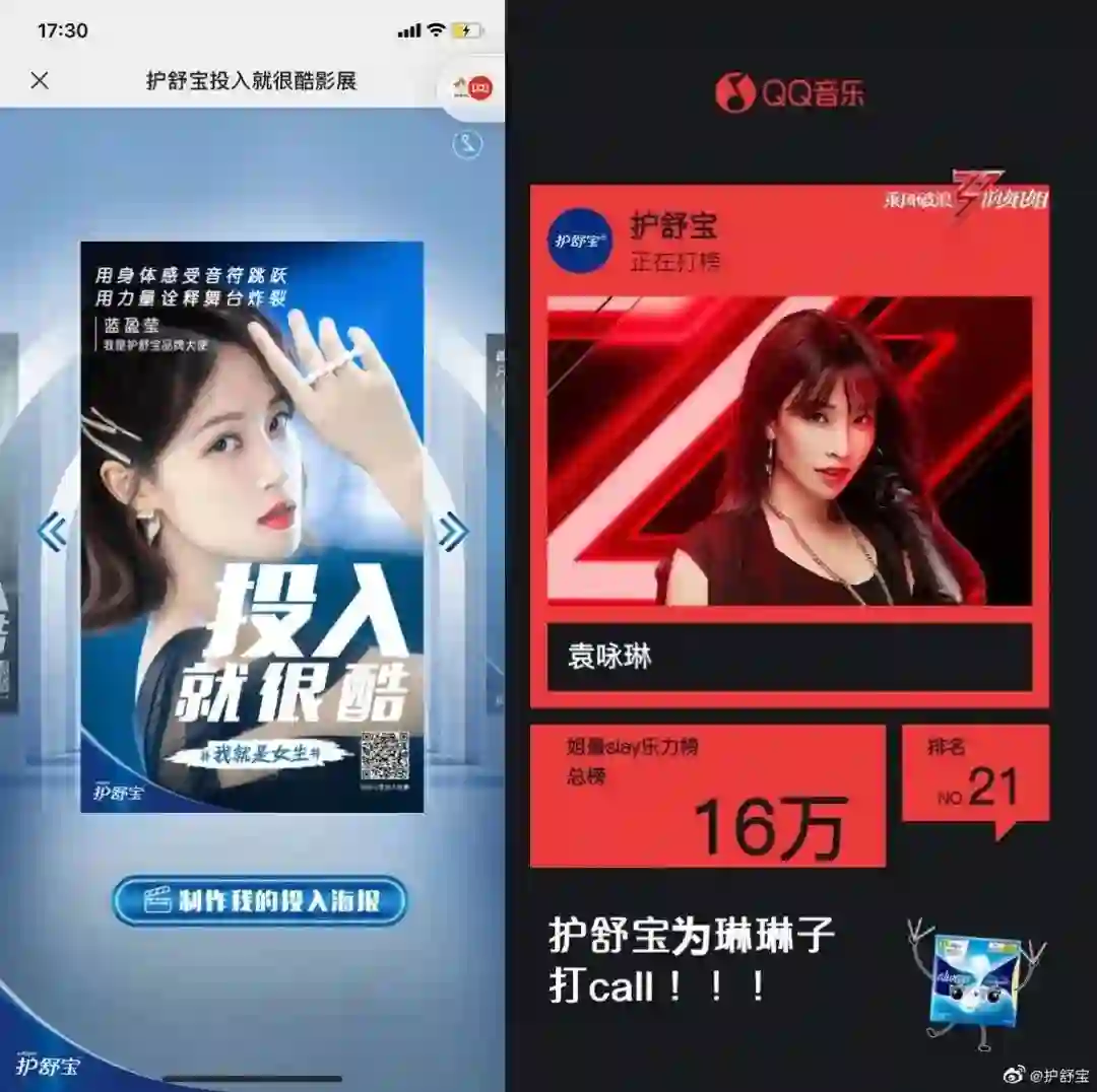 最为受欢迎的姐姐是蓝盈莹,其出现在金典和唯品会的剧场广告中,没有投放剧场广告的护舒宝,则选择了她作为品牌大使。护舒宝在节目内的权益有限,在节目外较为积极地进行跨界联动。它利用蓝盈莹与其他代言人的明星效应,发起一个“我就是女生”的H5影展制作活动,还联合QQ音乐进行音乐打榜,很大程度上在节目外试图触达更多年轻受众。