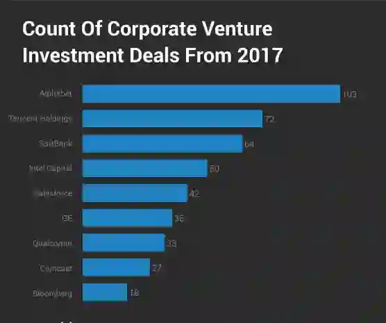 多年来,英特尔及旗下的风险投资公司英特尔资本(Intel Capital)一直是最活跃的企业风险投资者。但在2017年,Crunchbase的数据显示,Alphabet的主要风险基金超越了这家芯片制造商。腾讯控股及其风险投资子公司排名第二,拥有高达1000亿美元资本的软银在2017年共计宣布了64笔交易。