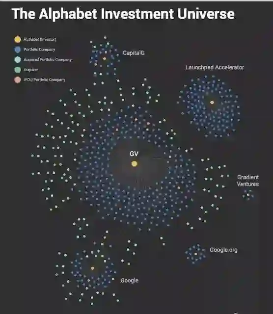 上述显示了Alphabet旗下各投资部门与其各自投资组合之间的联系。这幅图描绘了谷歌6大投资集团(上图标记为黄色)、570个投资对象和75家收购了Alphabet支持的投资组合公司的企业之间的676个连接。