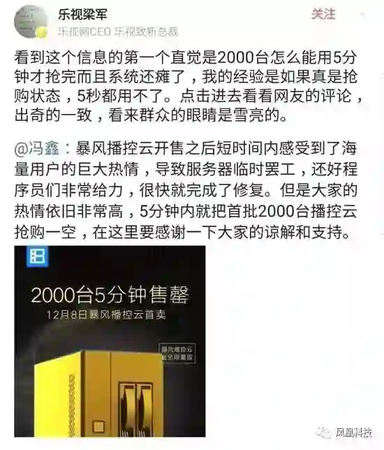 前几天暴风TV老板冯鑫发了一则消息,大意是网友们凭借自己强大的热情,把我们的服务器给吓坏了,我们的程序猿小哥哥们顶着巨大的压力把设备修复好后,产品销量迅速到达2000台!