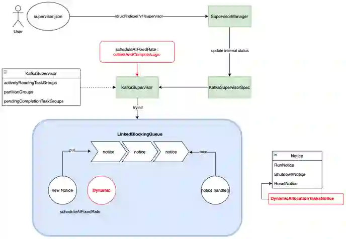 当需要将数据由 Kafka 导入 Druid 时,用户需要指定一个 Supervisor 任务,通过定义 Payload 文件以 Json 格式来描述需要导入的信息,并提交给 Overload 节点,由 Overload 节点通知 MiddleManager 启动 Peon 进程完成数据的摄入。任务提交后,交由 Overload 进程中的 SupervisorManager 对象处理,它对维护的 Supervisor 内部状态做必要的更新然后生成 KafkaSupervisorSpec 并交由 KafkaSupervisor 处理。KafkaSupervisor 负责管理 IngestTask 的生命周期,它接收 KafkaSupervisorSpec 作为输入,生成对应的 Tasks 并管理这些 Tasks 与 KafkaTopic 分区的映射关系。KafkaSupervisor 内部还包含一个处理线程,它不断的消费 Notice 队列的内容并调用对应的 handle 方法。Notice 是 Druid 中对 SupervisorOperation 的抽象表示,例如我们提交,暂停或者重置 Supervisor 时会分别对应 RunNotice,ShutdownNotice 和 ResetNotice。综上可见,我们要实现实时数据摄入的动态伸缩,本质上是要干预 Task 任务的生成。实时数据摄入的原理如下图,其中红色方框的部分为我们新增的部分,后文中将继续介绍。