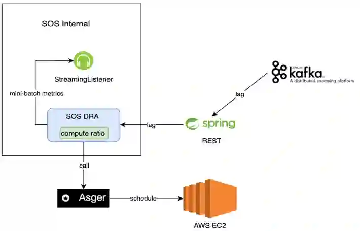其次,由于数据基础架构团队的软件服务都部署在 AWS EC2 上,因此 ScaleUp 和 Scale Down 会涉及 AWS EC2 资源的申请与释放。数据基础架构团队结合 AWS Auto Scaling Groups 自研 AWS EC2 资源服务 Asger。当涉及新增及删除 Executor 时,SOS DRA 会调用 Asger 服务,由后者完成 AWS EC2 资源的申请释放以及 SOS 应用所在 Yarn 队列的资源更新。第三,由于不想在 SOS DRA 中耦合更多逻辑,额外开发一个 Rest 服务,用于获取当前的 Lag 信息以及配置一些其他的调度规则等。第四,将每个调度周期计算的 Ratio 值及更新后 Executor 数量暴露到 JMX,这样这些信息最终会被采集并展现在基于 Datadog 构建的监控系统中用于实时追踪当前的调度情况。SOS DRA 的原理如下图。