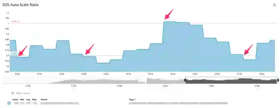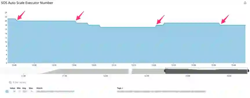 实际部署效果如下图示例,该示例中 SOS 应用启动时指定 20 台 Executor,并分别指定 ScaleUp 和 Scale Down 的阈值为 1.0 和 0.7。由下图一图二可见,分别在 12:45 左右,13:00 左右,当 Ratio 阈值小于 0.7 时,Executor 数量由 20 台逐渐缩减至 17 台。在接近 13:20,当遭遇突发流量波动,Ratio 值超过 1 时,Executor 数量由 17 台弹回至 19 台。当时间超过 13:35,Ratio 值再次小于 0.7 时,机器再次由 19 台缩减至 18 台。