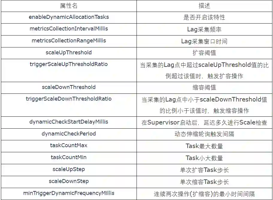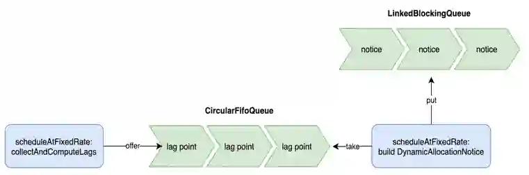 由于 Druid 摄入 Kafka 数据是否及时可以根据消费 Lag 来直接判断,因此我们按固定间隔采集 Lag 信息,基于此新增一种 Notice 的实现 DynamicAllocationTaskNotice 并将它插入到 Notice 队列里。具体地,在 KafkaSupervisor 中增加记录 Lag 的定长队列 CircularFifoQueue,按固定间隔插入采集到的 Lag 信息。当弹性伸缩的调度服务被定时触发时,它会创建 DynamicAllocationTaskNotice。当 DynamicAllocationTaskNotice 的 handle 方法被调用时,它会判断定长队列里 Lag 的情况,当超过 Scale Up 阈值的点的比例超过设置的阈值,则按指定的步长进行 Scale Up,反之,当小于 Scale Down 阈值的点的比例小于设置的阈值,则按指定的步长进行 Scale Down。同时,通过设定 Task 数量的最大值和最小值,来保障单个数据源占用的资源在一定范围内。原理图如下: