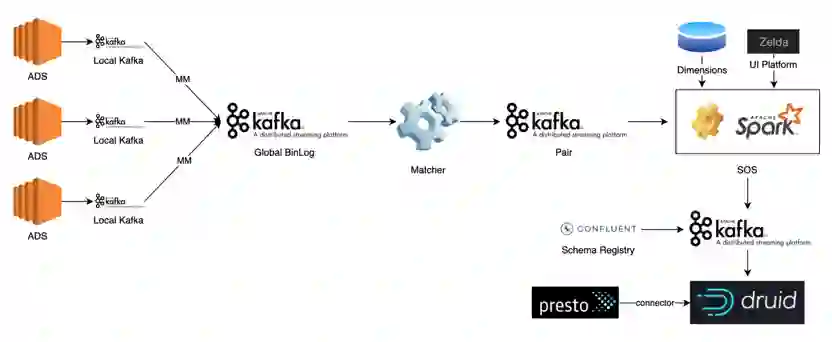如上图所示,FreeWheel 的广告服务器 ADS 部署在美国不同地区的 11 个 Data Center,例如 NYC,ASH 等,并将日志数据以 PB 格式写入本地的 Kafka 服务(LocalKafka),然后通过 MirrorMaker 等服务将数据同步到部署在 AWS 的 Global Kafka。Matcher 是 FreeWheel 自研的消息处理中间件,主要用于匹配广告投放过程中的 Request 和 Ack,并进行必要的数据去重。SOS 基于 Spark Streaming 和 SparkSQL,对实时应用开发中依赖的数据读写进行抽象及封装,并支持消费端位点管理,Join 维度数据,写数据幂等,数据模型依赖,弹性伸缩等特性。用户只需关心读写端元信息及用 SQL 表达计算逻辑而无需关心其他细节,同时为了 方便用户使用,结合 CICD 等为用户构建功能,性能以及回归测试服务,使用户的使用尽量趋于自助化(Self-Service)。实时数据处理的下游是基于 Druid 构建的数据存储及查询服务,并自研针对 Druid Segment 小文件的合并工具,基于实际流量进行数据摄入自动伸缩容,用户不友好查询的追踪分析等周边服务,保障高服务质量。同时,对于数据 Join 需求较高的场景,通过实现 Presto Druid Connector 来覆盖这一部分的需求。