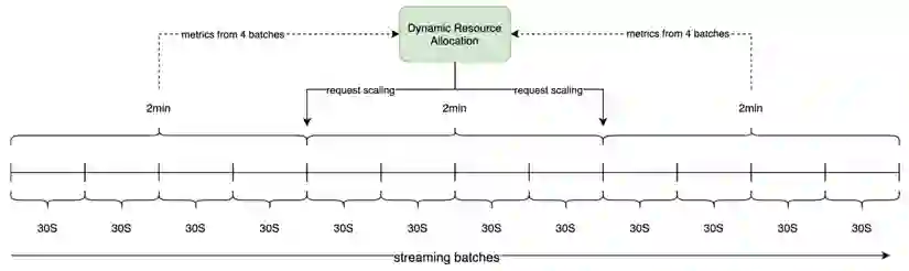 实际上,SparkStreaming 也有 Dynamic ResourceAllocation 的特性,不过在官方文档中鲜有提及。它的原理类似,在 Streaming 的 ExecutorAllocationManager 中同样启动一个周期运行的监听任务,它定时的判断当前计算资源是否充足,以此来计算是否要新增或者杀死 Executor,而判断的依据源于计算一个 Ratio 值,Ratio 值的计算依赖于 Spark 用于流式计算过程中收集 Metrics 的组件 StreamingListener。借助于 StreamingListener,可以在 Spark Streaming 每个 Batch 结束后获取关于该 Batch 处理的一些 Metrics,例如调度延迟(SchedulingDelay),处理延迟(ProcessingDelay),处理条数(NumRecords)等。