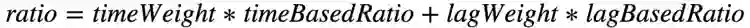 SOS DynamicResource Allocation(简称 SOS DRA)在继承原生特性的基础上,有几点定制化的实现。首先思考一个场景,假设 SOS 应用拉取 Kafka 数据的能力已接近瓶颈,基于当前的计算资源算出的平均处理延迟会趋于一个恒定值,假如此时数据生产的速度大于处理速度,那么整体来讲,SOS 消费数据的 Lag 仍在不断增长。因此,对于前文提到的 Ratio 值的计算,我们引入当前应用的消费 Lag,结合平均处理延迟来加权计算 Ratio。Ratio 的计算逻辑如下边公式所示: