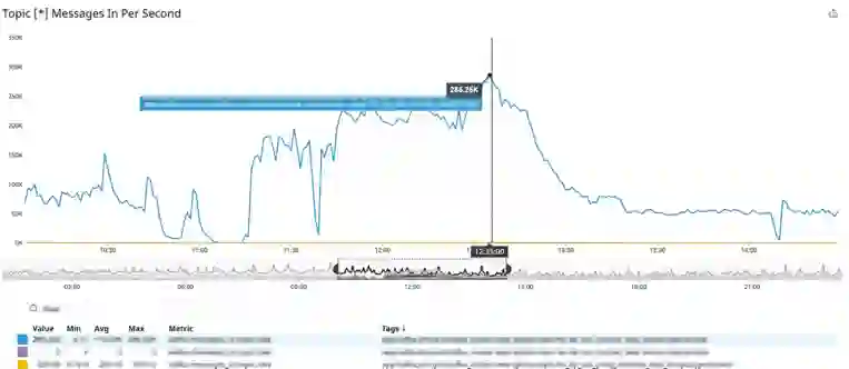 实际运行效果如下图所示,在美国大选期间的某一时间段,突发一流量高峰,从图一中可以看到某 Topic 在大约 11:20-13:20 之间流量从每秒不到 100K 条数据增长到最高值超过每秒 286K 条。图二为该 Topic 对应的 Druid 数据摄入的 Task 数量,如图中所示,大约在相同时间段,Task 数量从之前的 6 个自动扩展到 10 个,达到设定的最大值,在流量高峰过去后,自动缩回到之前 6 个的水平,整个过程无需工程师干预。