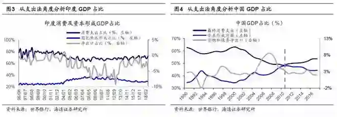 从支出法角度看,截至2018Q2,印度GDP中消费占比72%,固定资本形成占比29%,净出口占比-1%。而我国2017年消费支出GDP占比53.6%,固定资本形成占比44%,净出口占比2%。从支出法角度看,印度以消费为主,2000年以来消费占比平均70%,投资平均占比30%;而我国投资占比更高,2000年以来消费占比平均53%,而投资占比平均43%。