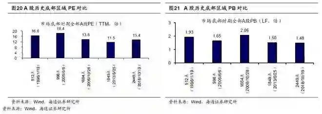 对比过去几次市场底部,如1996年1月19日上证综指512点、2005年6月6日998点、2008年10月28日1664点、2013年6月25日1849点时期,目前全部A股PE(TTM,下同)为13.4倍、PB为1.48倍,较前四次市场底PE11.5~18.4倍、PB1.5~2.1倍,已经处于区间的下轨附近。