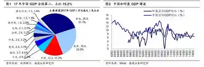 截至2017年,我国GDP总值约12.2万亿美元,在全球GDP中占比15.2%,全球排名第二。目前印度的人均GDP水平还相对较低,截至2017年印度人均GDP为1939美元(相当于中国2006年人均GDP的2099美元),我国为人均8827美元。考虑货币购买力,实际相当于更早期的中国。