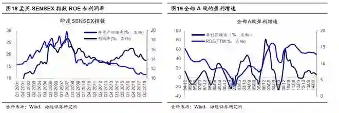 虽然孟买SENSEX指数的估值创了历史新高,但孟买SENSEX指数的ROE正在创历史新低。孟买SENSEX30指数的ROE水平从2011年以来持续回落,从2011年最高的19.7%回落至目前的11.5%,处于2001年以来的历史最低水平,也低于沪深300指数的13%。