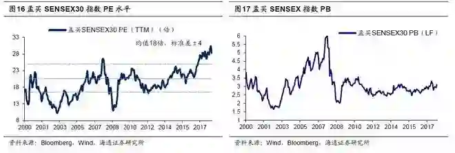 从08年低点以来,印度股市已经历了10年长牛。孟买SENSEX30指数估值(PE(TTM),下同)在2018年8月达到历史最高的30倍,在全球主要市场中仅次于纳斯达克指数的45倍。2000年以来孟买SENSEX30指数PE(TTM)均值为18倍,1倍标准差±4。