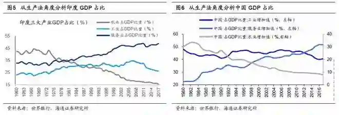 从经济结构来看,根据世界银行数据,截至2017年,印度GDP中农业占比15.5%,工业占比26%,服务业占比49%。而我国GDP中农业占比仅8%,工业占比40.5%,服务业占比51.6%。2000年以来,印度GDP中服务业占比持续提升,工业和农业占比持续下降,并且工业的GDP占比基本低于30%;我国从2000年以来服务业占比也从40%提高到51.6%,但工业的占比始终在40%以上。