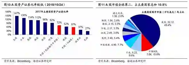 从证券化率来看,印度股市证券化率(总市值/GDP)达92%,而我国全部上市企业证券化率为72%(含海外中资股),以A股上市公司口径计算的证券化率仅57%,而美国、英国整体证券化率分别为147%、114%。