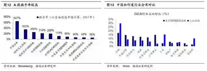 从换手率来看,2017年印度孟买SENSEX指数换手率90%,远低于万得全A按自由流通市值计算的换手率647%,也低于美国标普500指数的214%和英国FTSE100的256%。