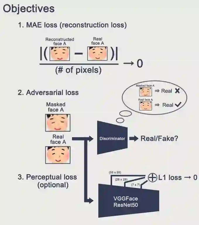 版本二我不打算讨论,仅介绍一下,简而言之就是增加了 Adversarial Loss 和 Perceptual Loss,后者是用训练好的 VGGFace 网络(该网络不做训练)的参数做一个语义的比对。