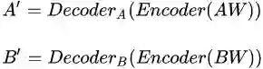 这里的 XW 是经过扭曲处理过的图片,用过 Deepfake 的童鞋可能会有人提出质疑,「要让代码跑起来好像必须要有两个人的人脸数据吧」。没错,之所以要同时用两个人的数据并不是说算法只能将 A 与 B 互换,而是为提高稳定性,因为 Encoder 网络是共享的,Deocder 网络是分开的,上公式:
