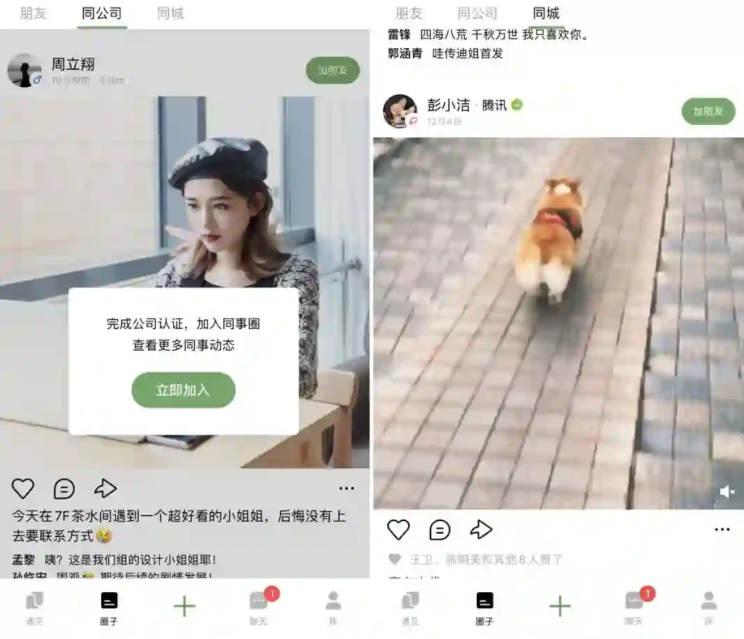 在用户上传职场真实身份的同时,腾讯也因此获得了一个完整庞大的职场人脉圈。“朋友”同样也能用实名社交的关系网,做起一个包含职场社交功能的产品。