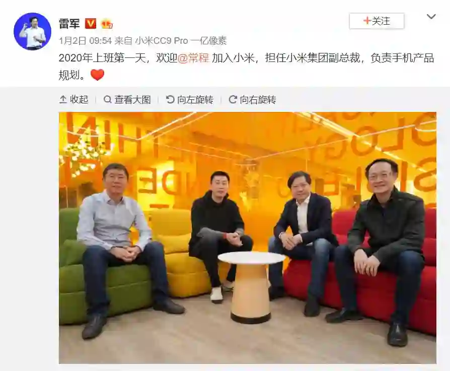 「2020 年第一个工作日,欢迎常程加入小米,担任小米集团副总裁,负责手机产品规划。