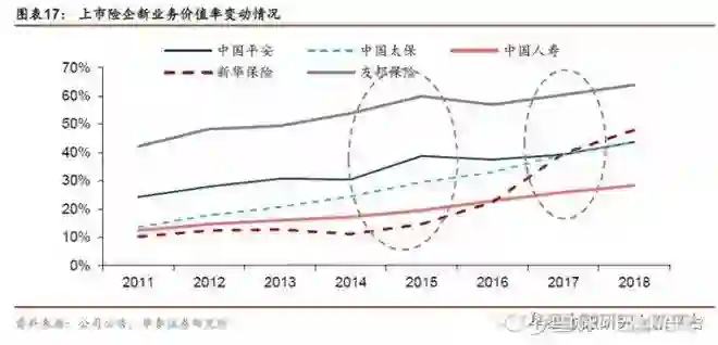 NBV高增长,助推保险股走强。新业务价值既体现新单规模,也体现具体的产品结构质态,是市场最为关心的负债端核心指标,其变动直接影响估值指标EV的增幅。上市险企2009年、2015年和2017年的NBV增速均较为可观,分别实现约20%、15%和50%的增长,我们认为市场对NBV增速提升的预期提振板块表现,助推保险股走强。