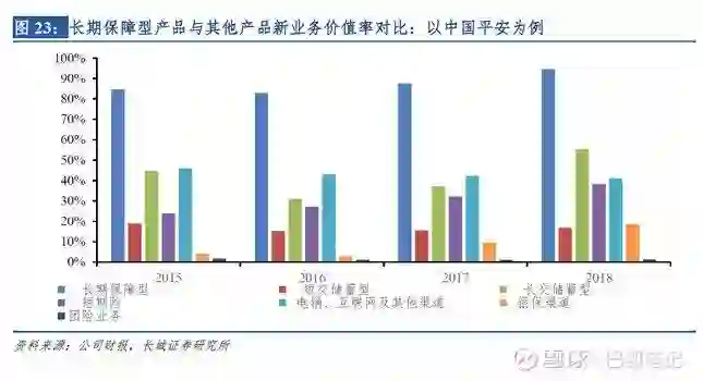 从追求规模增长向高价值率转型,回归保障推动产品结构改善。(1)据银保监会数据,2007年银保渠道保费在总保费中占比由2003年的17%大幅提升至34%,且各大险企以大力发展投连险为主要目标,规模保费快速提升而产品价值率处于绝对低位。(2)2011年银保业务监管加强,导致部分险企选择性放弃银保业务,叠加2013年预定利率上限的放开,传统险规模快速提升。(3)2015年监管加强对举牌资金的监管,万能险业务严重放缓,健康险业务增速提升,此外随着“保险姓保,回归保障”的推进,134号文叫停快返型年金险,各大险企主动转型,向高质量业务方向发展,推动新业务价值率持续攀升。友邦中国新业务价值率长期保持在80%的高位水平,整体价值率水平在60%左右,进而推动其P/EV估值保持在2x区间波动,可见高价值率的产品结构有望提升整体估值中枢水平,我们认为未来险企将逐步从追求规模增长转型价值提升,保障险与长期储蓄险的占比有望逐步提高,整体价值率水平有望步入新台阶。