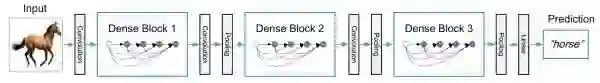 作者认为直接相加的方式会阻碍信息在网络的流动,所以很简单的实现就是将所有的feature map直接拼接。但这种直接的拼接方式会使得最后得到的featuremap通道数急剧增加,因此作者并没有将这种方式应用到整个网络,而是设计成Dense Block,整个网络方式如下图: