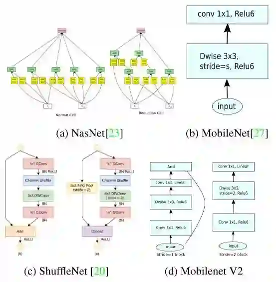 上图就是ShuffleNet V1和V2的比较,前面两个为第一版的结构图,可以看出,第二版为了效率舍弃了原来的pointwise的分组卷积形式,改成普通卷积。为了避免BasicBlock中最后element-wise sum的操作,引入了channel split首先将通道分成两半,进入两个支路,最后使用Concat操作来代替原来的sum操作,既保持了通道数量的不变性又避免了element-wise的操作!太厉害了!进行Concat操作后,接着跟着一个channel shuffle的模块,用于通道间的信息交流!