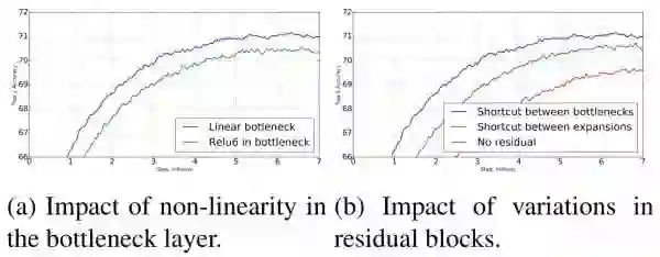 根据上面的原因,作者建议通过插入Linear Block到卷积层,从而保留非线性的同时避免丢失太多的信息。因此MobileNet V2中的Block在卷积层中加入了Linear Block,然后还有跳过连接的方式。接着作者又探讨了上图C和D两种结构的优劣性,也就是Linear Block放在那里的问题!下图为实验结果: