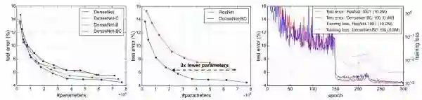 本篇论文从图中可以看出,是对ResNet进行了改进,作者总结了一下近几年的文章,在提高网络性能方面要么网络越深,要么网络越宽,但作者使用了一个更为激进的特征重用策略,把ResNet的单层特征重用扩展到多层,但参数量更少。相比于ResNet,其有很多优点,比如多层直接连接加强了特征的传递,减轻了梯度消失的现象,减少了参数量!正是因为参数量的减少,其具有一定的防止过拟合的能力!