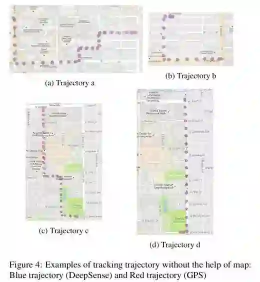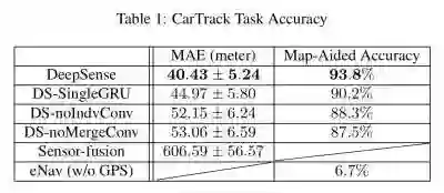 以下是 DeepSense 相对于传感器融合和 eNav 算法在汽车跟踪任务上的准确度。地图辅助准确度栏显示了位置被映射到地图最近道路段时得到的准确度。