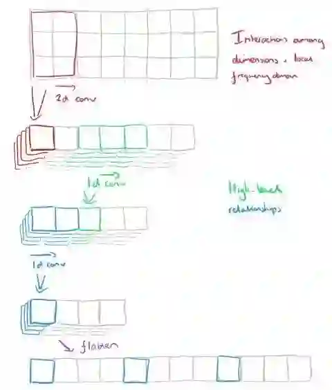 将所有的信息都很好地封装在单个张量中这一点是很方便实现的,但实际上我们将在 t 维中逐层处理(一次一个窗口)。每个 d x 2f 窗口切片通过卷积神经网络组件包括三个阶段,如下图所示: