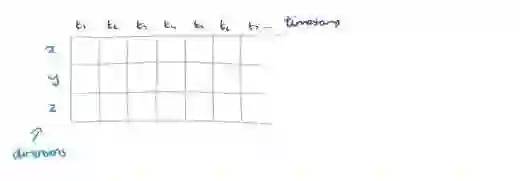 我们先考虑单个传感器(最终我们希望构建应用程序,将多个传感器的数据组合起来)。单传感器可以提供多维测量,例如运动传感器,它会沿着 x、y 和 z 轴报告运动。我们每隔一段时间(即时间序列)收集这三个维度中的传感器读数,我们可以用如下形式表示: