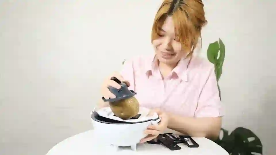 操作十分方便,只要把土豆扔进去,转动把手就能迅速肢解土豆!我计算了一下,切一个土豆只需要30秒。这就相当于一个大号的卷菜刀,整个暴风吸入。