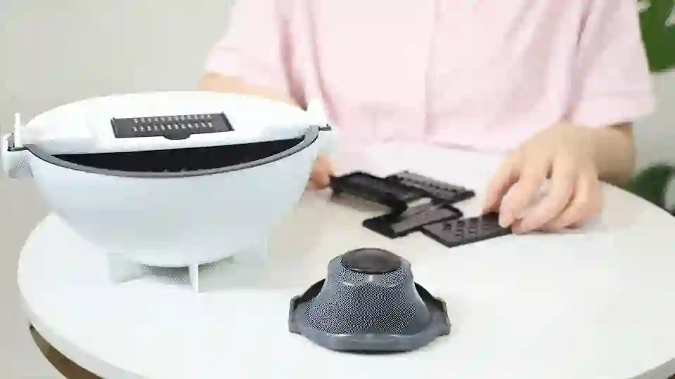 别看这个东西长得像外星人派到我球的飞船,实则是集擦丝儿、洗菜、沥水三位一体的多功能切菜机器。我买的仅仅是入门款就配备了6种不同擦丝风格的刀片!