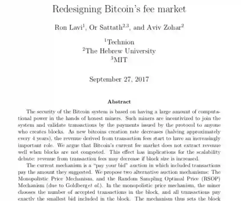 [2] Ron Lavi, Or Sattath, Aviv Zohar,“Redesigning Bitcoin's fee market”Sep 26, 2017, https://arxiv.org/abs/1709.08881