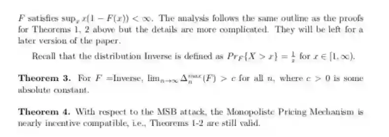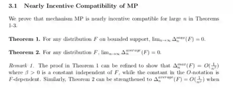 垄断价格(MP)机制是一种自然而实用的机制,尽管并非严格意义上的激励相容。他们的广泛模拟结果显示,这个机制在多数独立同分布的情况下,都不会太过偏离激励相容。也对某种有限大小下离散分布的特殊情况进行了分析。