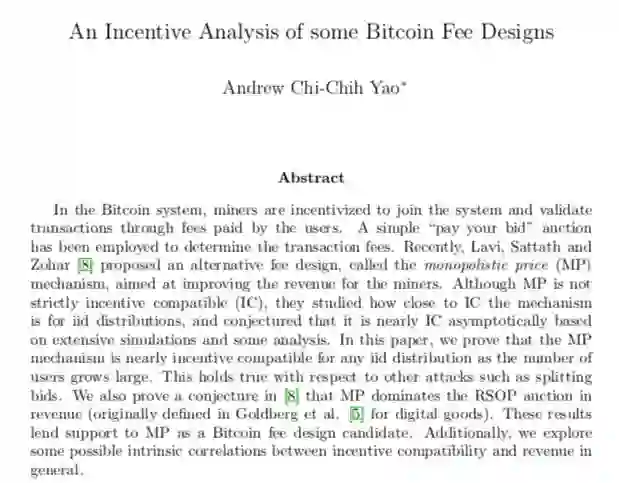 著名计算机学家、图灵奖唯一华人得主姚期智也注意到了这个问题。他的最新发表论文《比特币费率设计的激励分析》(An Incentive Analysis of some Bitcoin Fee Designs),就以比特币交易费机制为主题,从数学的角度为近期学界提出的创新机制,提供了支持与佐证。