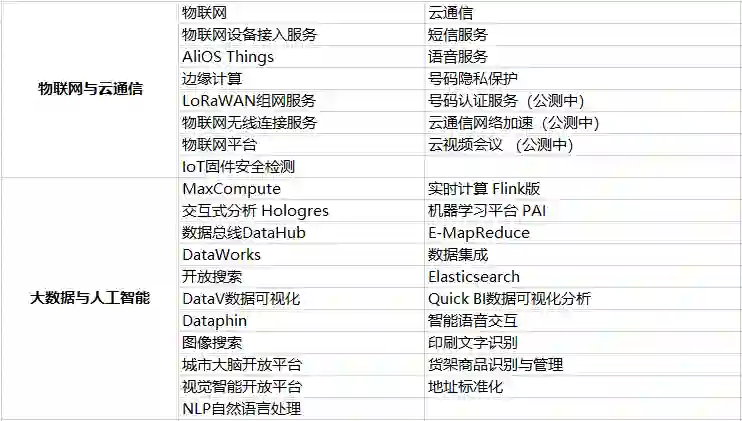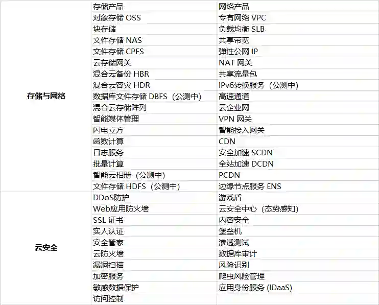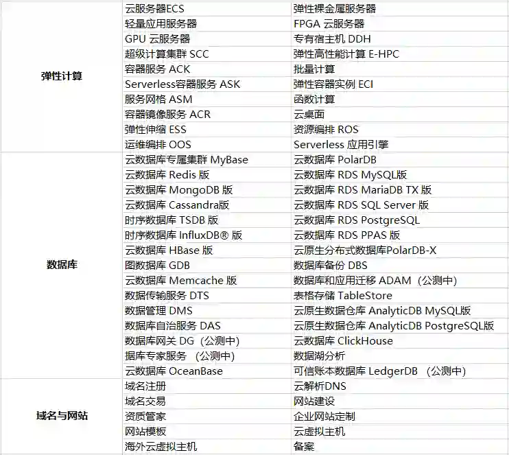 小枣君以目前国内某云计算服务商所提供的服务为例,整理了一个产品表格,如下: