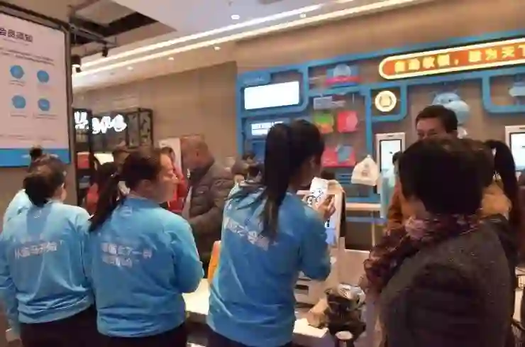 顾客逛到收银台附近时,热心的工作人员会上前询问是否已经下载了盒马鲜生的手机客户端。如果还没有的话,工作人员会协助你下载,并详细介绍如何使用手机客户端自助结账。