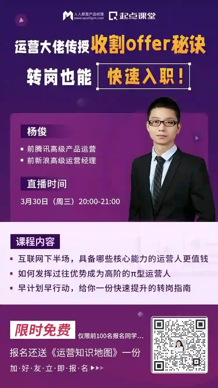3月30日(周三)20:00 ,前腾讯高级产品运营、拥有16年运营经验的@杨俊老师,为大家带来一场免费的直播课!
