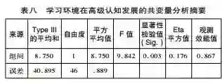 为了探究整合语义图示工具在提升学习者深度理解上是否有显著优势,本研究对控制组和实验组学习者后测深度理解的数据进行了独立样本单因子共变量分析,共变量为深度理解的前测数据,因变量为深度理解的后测数据。由回归系数同构性检验结果可知,F值未达显著(F=1.176,P=0.254>0.05),符合回归系数同构性之假定,可以进行共变量分析。由表八可知,两种实验情境中学习者深度理解的后测成绩存在显著性差异(P=0.003<0.05)。比较得知,实验组学习者深度理解(M=4.3,SD=0.20)高于控制组学习者的深度理解(M=3.5,SD=0.19)。由此可判断,相比于整合基于文本的协作学习工具,整合语义图示工具能更好地促进学习者的深度理解。